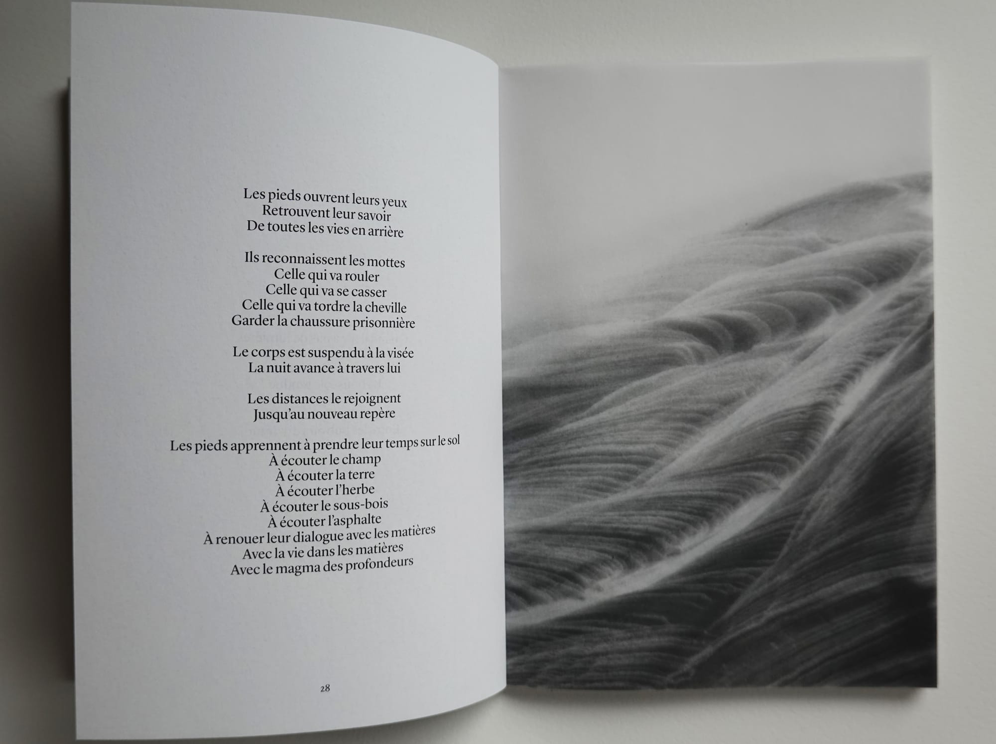 Les courbes rythmiques des oscillographies d’Anne Pantillon entrent en dialogue avec les poèmes, ouvrent des espaces au lecteur qui devient marcheur à travers la nuit jusqu’au point de ralliement. Ces peintures portent en elles la visualisation à la fois concrète et abstraite du paysage ressenti. La plasticienne a utilisé la technique des empreintes pulsées : le déplacement de la trace du bras sur le papier relaie celle déposée par le marcheur dans le paysage, imprime par un mouvement rythmé les courbes de niveau de la carte géographique.